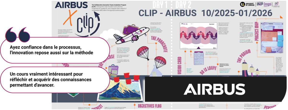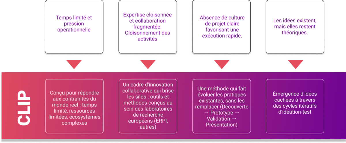 CLIP un Programme d’Incubation d’Équipes d’Innovation Collaboratives Nous aidons les équipes à transformer leurs idées en solutions validées, en accord avec leurs valeurs personnelles et organisationnelles, grâce à un programme d’innovation itératif et collaboratif. Notre approche renforce la cohésion d’équipe, libère la créativité et accompagne les participants de l’intention à l’impact, avec un processus de validation concret. NOtre solution pour répondre à vos enjeux Vous avez du mal à développer et à faire évoluer vos idées dans un écosystème complexe ? De nombreuses équipes sont confrontées aux mêmes obstacles : manque de coordination, ressources limitées, collaboration fragmentée, priorités concurrentes et difficulté à transformer les intentions en résultats concrets.CLIP vous aide à surmonter cela. Vers la constitution de communautés qui impulsent le changement Nos collaborations vous voulez en apprendre davantage ? Envoyez nous un e-mail et recevez notre plaquette informative sur le fonctionnement du CLIP ensgsi-clip-contact@univ-lorraine.fr personnes ressources Conception – Innovation Ferney OSORIO Maître de Conférences Email : ferney.osorio@univ-lorraine.fr Voir les infos du contact Email ferney.osorio@univ-lorraine.fr Conception – Innovation Manon ENJOLRAS Maître de Conférences Téléphone : +33 3 72 74 35 56 Email : manon.enjolras@univ-lorraine.fr Voir les infos du contact Téléphone +33 3 72 74 35 56 Email manon.enjolras@univ-lorraine.fr
